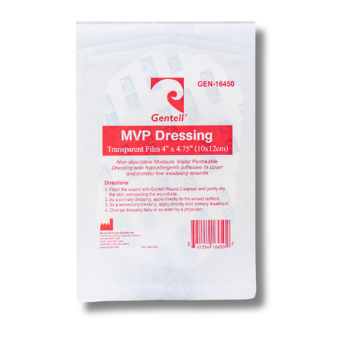 Gentell MVP Transparent Film Dressing is a moisture vapor permeable transparent membrane coated with a layer of acrylic hypoallergenic adhesive that can be used to cover low exudating wounds.