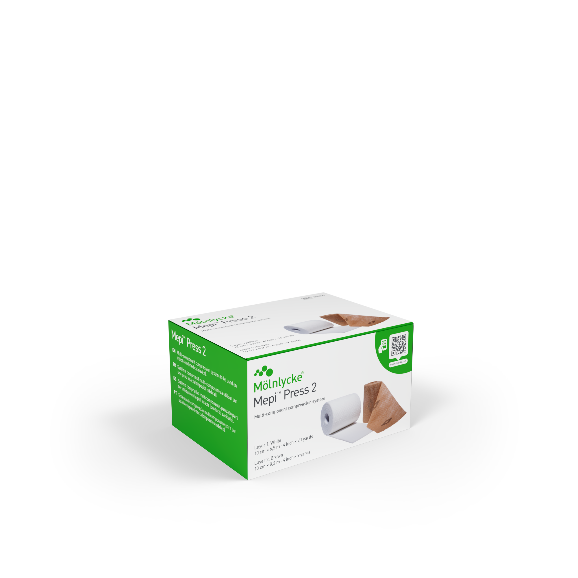 Mepi Press 2 is indicated for long-term compression therapy for venous diseases and edema caused by other factors (in patients with an ABPI—ankle brachial pressure index—of 0.8–1.3). Positioning the two bandages in a layered combination forms a compression system, which can be worn for up to a week, depending on the condition of the wound and the time for which the wound dressing is worn.