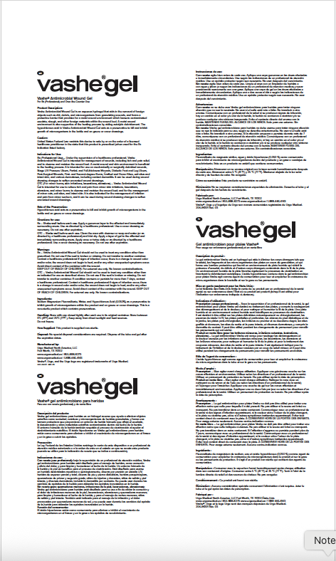 Under the supervision of a healthcare professional, Vashe Antimicrobial Wound Gel is intended for management of wounds, including itch and pain relief, and to cleanse and moisten the wound bed. A moist wound and skin environment is beneficial to the healing process. It is intended for use on mechanically or surgically debrided wounds, stage I-IV pressure ulcers, partial- and full-thickness wounds, diabetic foot and leg ulcers, post-surgical wounds, first- and second-degree burns, grafted and donor sites exit sites and intact skin, and various dermatoses, including contact dermatitis. It can be used during wound dressing changes to soften encrusted wound dressings.