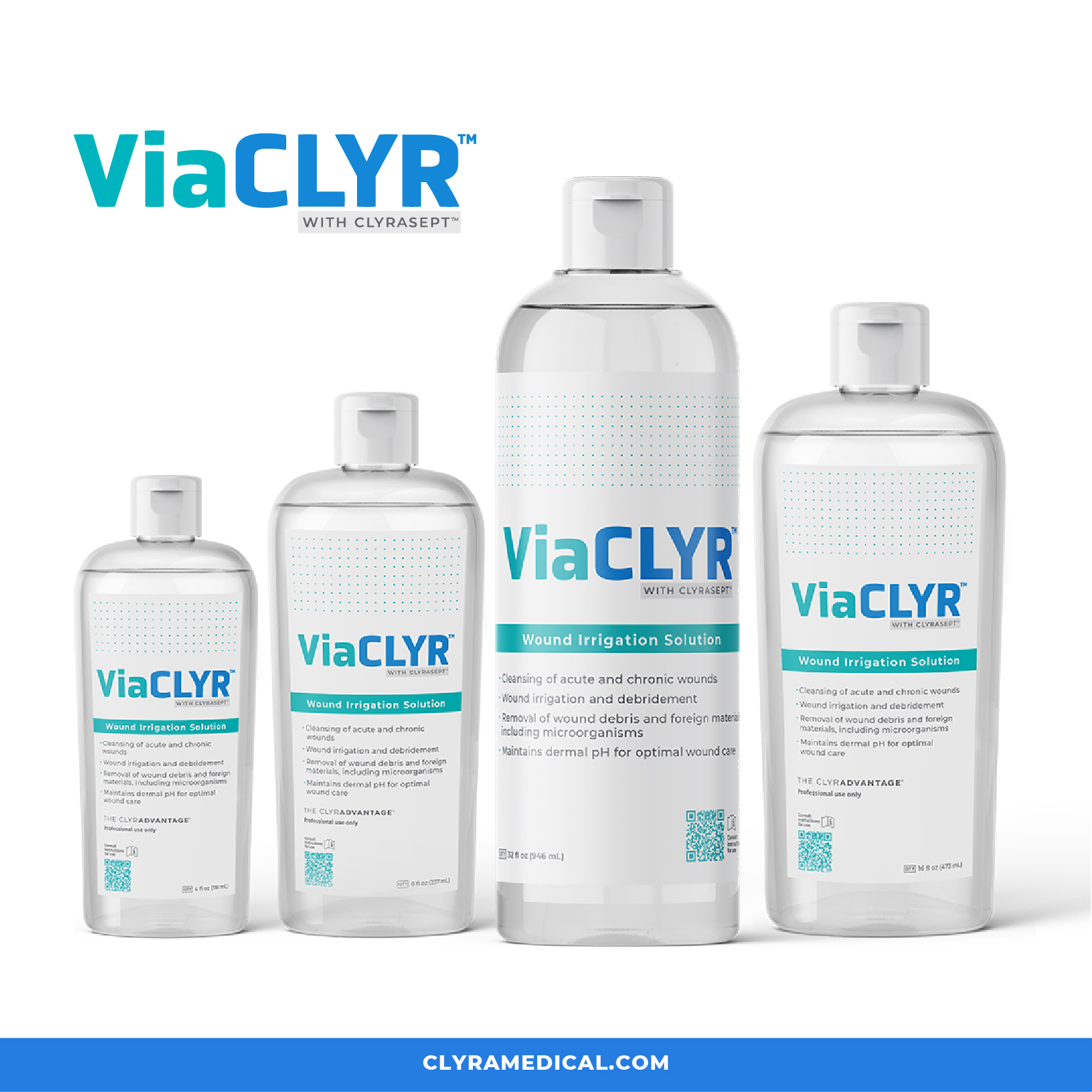 ViaCLYR™, based on the patented Clyrasept Regenerative-Iodine technology™, is a highly effective, pH balanced, tissue-safe and long-lasting antimicrobial wound irrigation solution for cleansing, irrigating, and debriding acute and chronic wounds and burns.